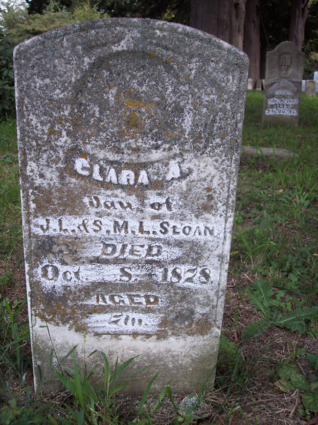 | Sloan, Clara A. dau of J.L. & S.M.L., died Oct 8, 1878 aged 2y 7m 16d Union Grove Cem |