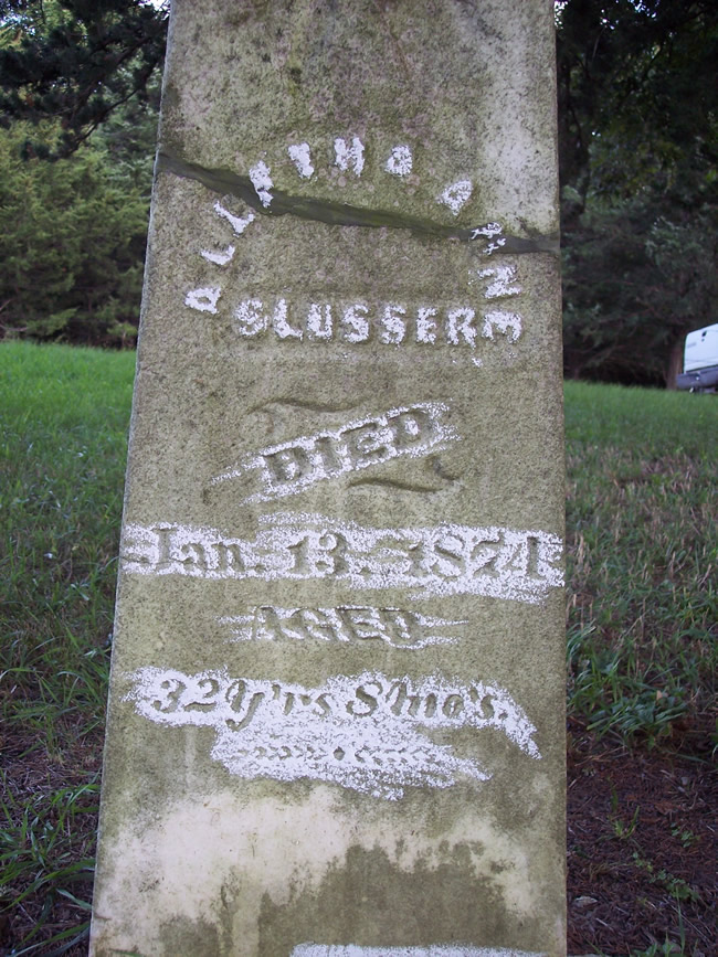 | Slusser, Alletha Anne, died Jan 13, 1874 aged 32y 8m Union Grove Cem [stone cut by] |