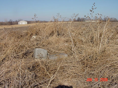 | Condition | Cemetery is in a weeded area in the middle of the field. There is no fence and it is not maintained. The tall monument that was noted in earlier years is now laying down on the ground. There are no trees as mentioned earlier; they must have been dozed over because there was a pile of trees about 200 yards southeast of this area. (2008) | |||||||