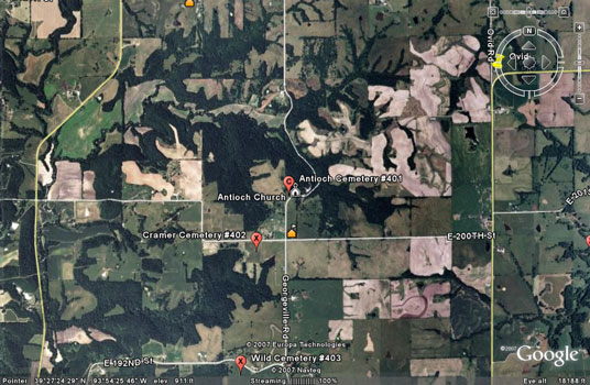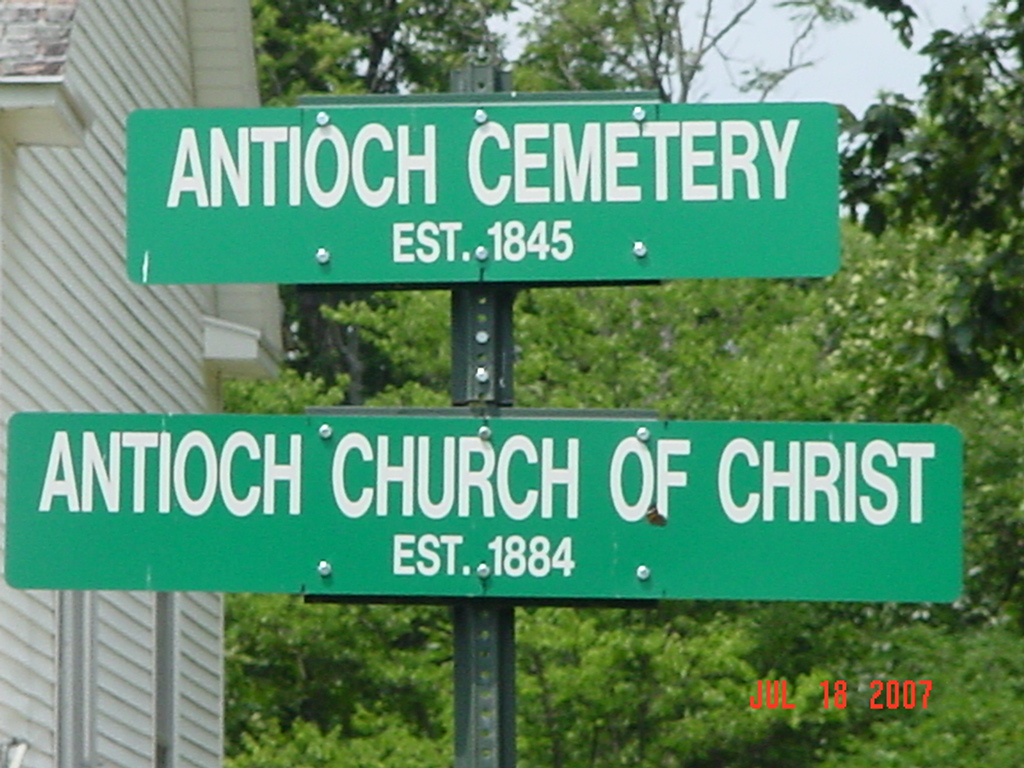 Antioch Cemetery established in 1845; Antioch Church of Christ established in 1884 well kept cemetery, approximately 139 marked graves (1994) aka Wild Church Cemetery as noted in the obituary for Seymour Coffman on county road 100 at jog in road, 0.5 miles north of county road 97 Located three and one half miles north of Millville, MO on Georgeville Rd, 1/4 mile north of 200th Street |