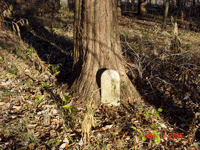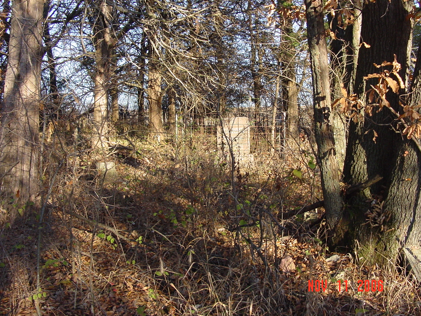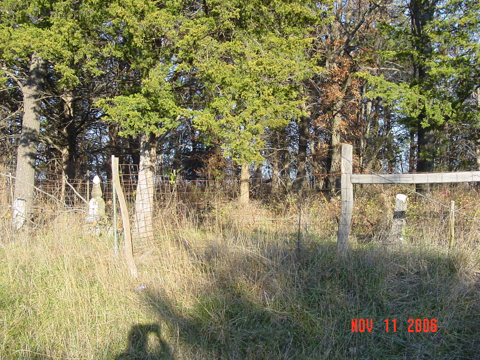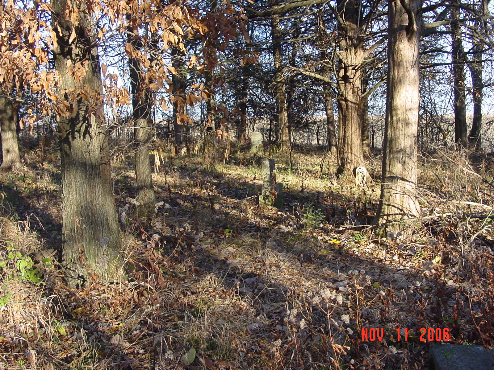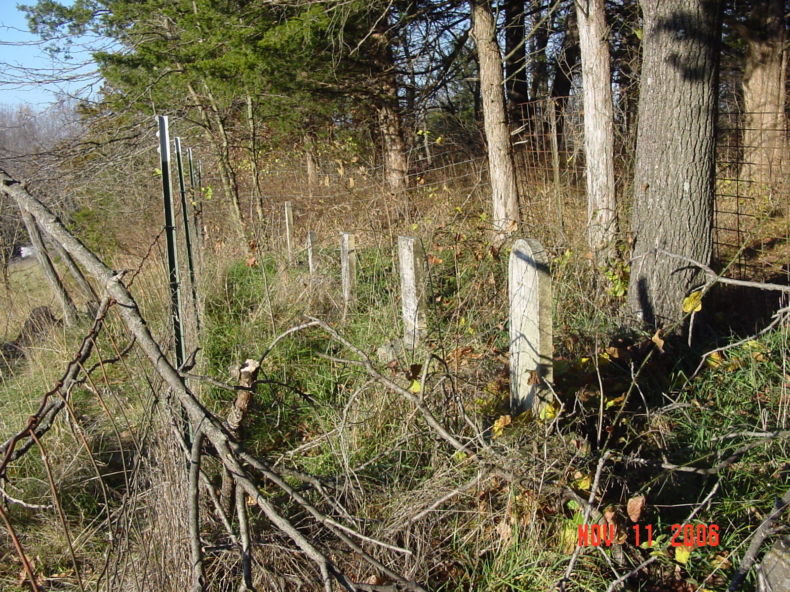 Cemetery is located on the north side of "V" highway between Moss Road and Claypole Lane. A green sign marks the cemetery entrance. The cemetery is located north of the cattle gate and east of the old lane. The entire cemetery is surrounded by a fence and many stones are grouped together and surrounded by additional cattle panels. It appears that families may have enclosed these stones for additional protection from the cattle. |