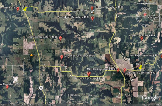 #9 on Knoxville Township Map #9 on Ray County History 1973 map, p. 230 Knoxville Township (Cramer or Smith Cemetery) typed sheet in big black Cemetery binder at Ray County Library (Clark-Crammer Cemetery): located highway 13, turn east on Millville Road [Hwy K] eight tenths of a mile; turn north to first lane east, about 1/4 mile northeast, Cemetery is well fenced DAR Index: Clark/Cramer Cemetery - Located in Knoxville Twp. Take Dockery Road 1/10 mile north of Route K. Cemetery is on east side of road, 100 yards in field. cemetery marked on 1914 Plat Book on Van Wall property (Section 7) Lisa: Van Wall's death certificate states he was buried in Van Wall Cem. However, everyone else for the Cramer/Crammer Cemetery states that they are buried in Cramer/Crammer Cemetery. |