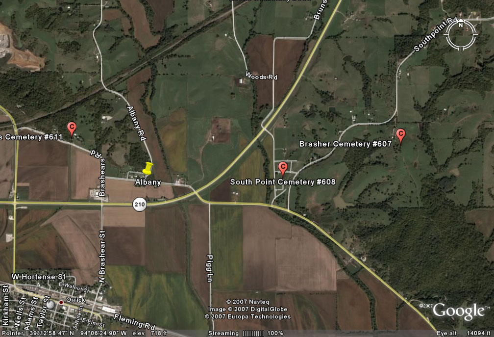 May 1941 The South Point Cemetery Association was formed. The affairs of the association were to be managed by a board of trustees consisting of six members. The first were - Mrs. Lora Offutt, president; C. A. Gooch, vice-president; Mrs. Edith Hendrix, secretary; Arch Kirkham, treasurer; Mrs. Mary Sheetz, and E. A. Paulson. In 1965 the listings of the cemetery showed over 720 graves. The first was that of Lewis Pigg, February 8, 1783-Apirl 5, 1845. The people of the Orrick Community are proud of this cemetery which is well kept. It is located on a peaceful and serene hill-top, one and one half miles east of Orrick on Highway 210 and one-fourth mile north on Route E. (1973 - roads have changed since then) --- DAR Index: located at Hwy T and Hwy EE (Southpoint Drive) --- It has been observed that in old obituaries when the place of burial is said to be: "in the cemetery at South Point Church", the burial is actually in Brasher Cemetery and not at South Point Cemetery. |