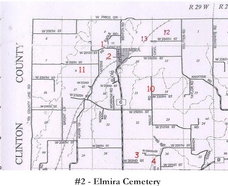 | Elmira Cemetery | #2 on Polk Township Map | Longitude: 39°30'29.00"N Latitude: T54R29S09 |