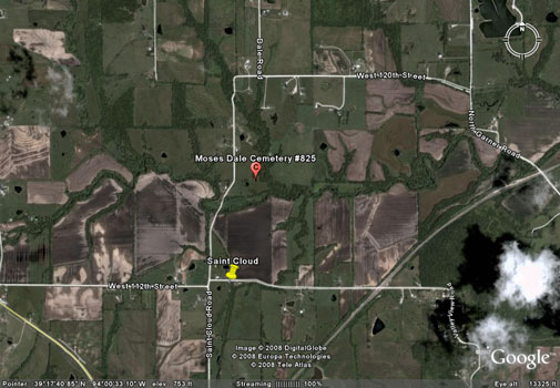 | Most recent directions | From the intersection of Business Hwy 10 and St. Cloud Road west of Richmond, travel north on St. Cloud Road. At W. 112th Street continue north on St. Cloud Rd for 1/2 mile. The road will turn slightly northwest and then straight north. At the point where the road turns straight north there is a wooden gate on the east side of the road. The cemetery is about 200 yards straight east of the road in a tall grove of trees. | |||||||