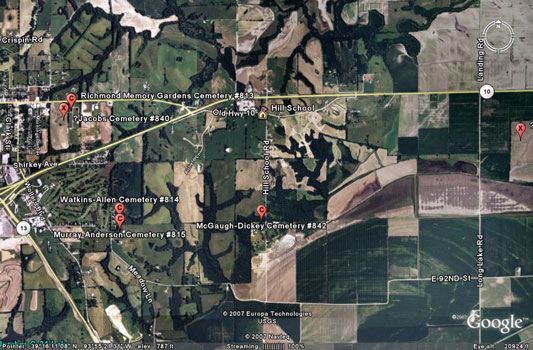 listed in Thurman Funeral Home Records book as east of Richmond DAR Index: go east of Richmond on Old Hwy 10, then south on Hill School road. Cemetery is on the west side of the road. |