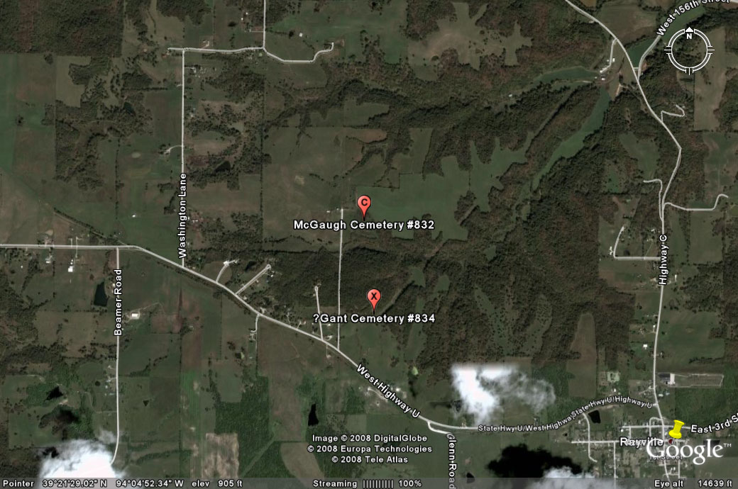 | Most recent directions | From the intersection of Hwy C and Hwy U in Rayville, travel west on Hwy U for about 1.3 miles. Turn north on White Lane and proceed to the end of the lane about 1/2 mile. Cemetery is located about 150 yards east of the lane in a small wooded area that lies in the middle of a cattle pasture. (2008) | |||||||
