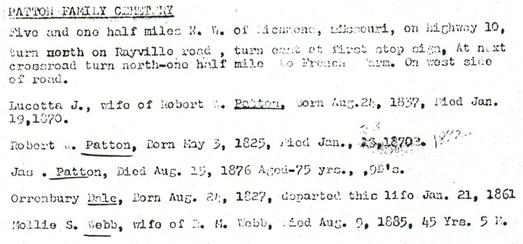 1. Then we went to the Ray County Library and I found the obituary for James Patton in the Richmond Conservator, Thursday, January 28, 1892 issue. The obit states "R. W. Patton died at his home, three miles north of Richmond, on Saturday, January 24th, [this day differs from the listing of the cemeteries] of la grippe, in his sixty-seventh year.".............................[will not type all of this obit but it does say James Patton was married three times with Lucetta being his first marriage]...................and it ends saying "Funeral services were held at the church, near the late home of the deceased, by Rev. E. McNair, after which the remains were interred in the family burying ground, near Swanwick, followed thence by relatives, friends and neighbors."