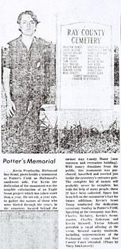 Located on West Royle Street, Richmond, Missouri, back of what was once "The Old County Home". It is now a recreational center and Ray County Museum. The monument in Potter's Field was put up as an Eagle Scout project, September 13, 1979, by Kevin Pemberlin, Richmond, Missouri, Troop 465. |