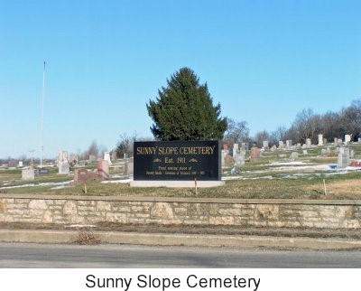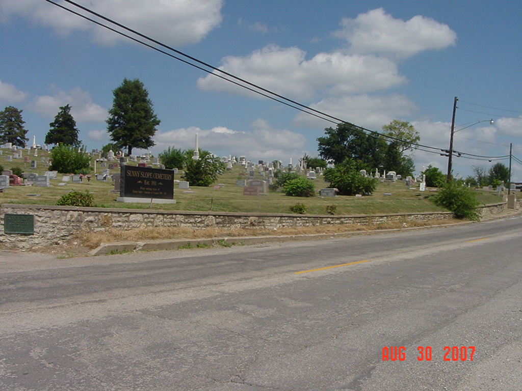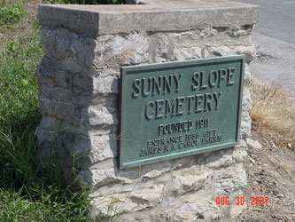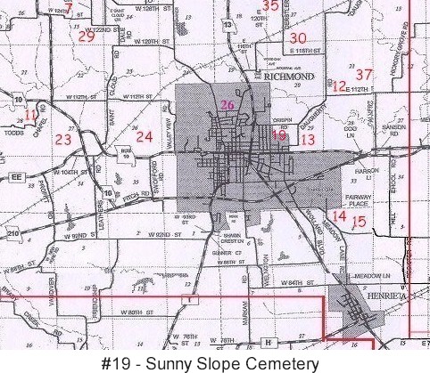 Sunny Slope Cemetery was founded in 1911. The cemetery is located on West Main Street in Richmond. Sunny Slope lies west of Richmond Cemetery. There is one joint entrance and exit road for Sunny Slope. This newspaper article discusses the proximity of these four adjoining cemeteries. |