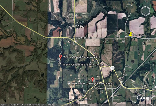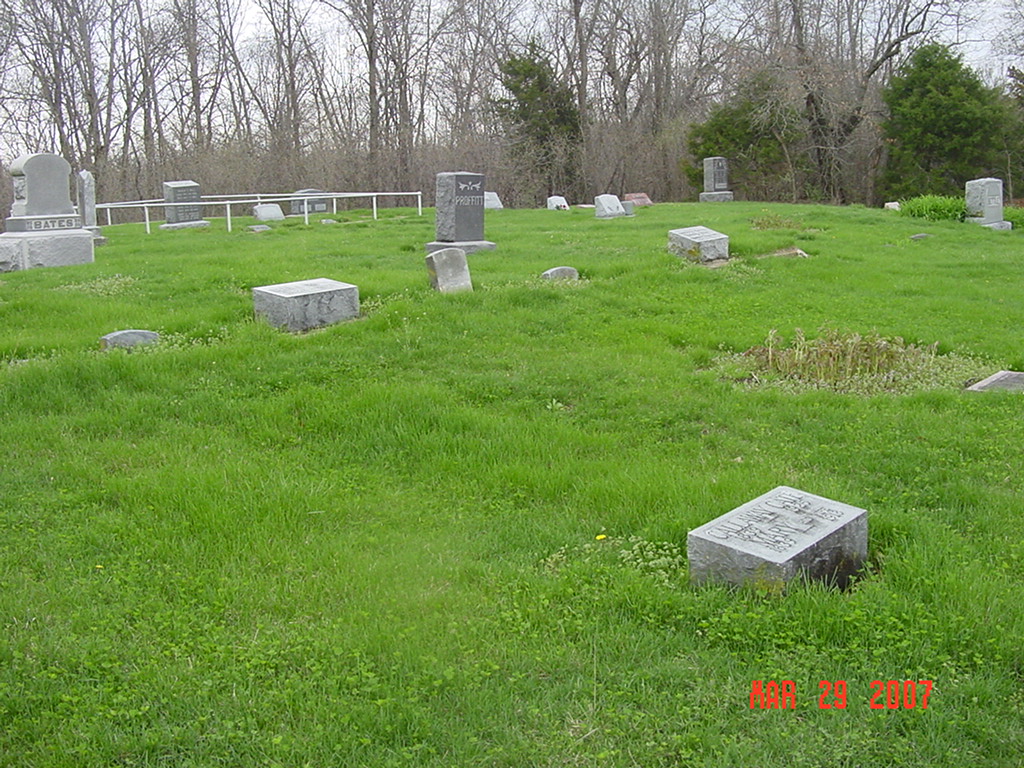 From the intersection of "C" Hwy and Hwy 10 (west of Richmond) travel 2/10 miles west. Turn south onto Todds Chapel Road. Cemetery and church are about 1/2 mile down this gravel road. 1973 History of Ray County: One of the plats of the cemetery was drawn up and laid out on a piece of cloth, dated 1858. William Bales, a private in the War of 1812, is buried here. He was among the early pioneers of Ray County. The cemetery is maintained by donations; recently a trust fund has been established hopefully to reach the amount for perpetual care. Clinton Arnold is the trustee. (1973) |