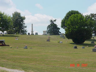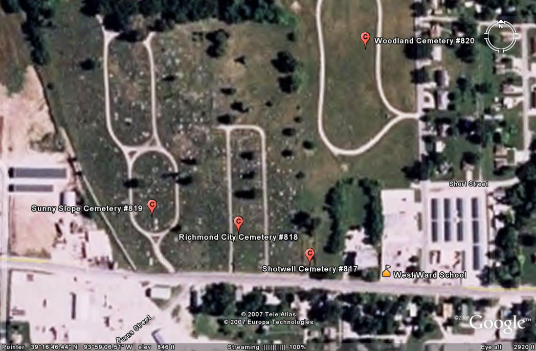 Four cemeteries are immediately adjacent to each other north of Highway 10 in Richmond, Missouri. Sunny Slope Cemetery is located on the west, Richmond City Cemetery next to it on the east, Shotwell Cemetery next to it on the east, and then Woodland Cemetery, the furthest east. This newspaper article discusses the proximity of the four adjoining cemeteries.