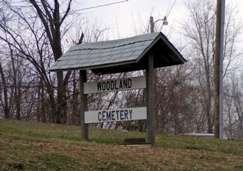 Wilson Avenue entrance to Woodland Cemetery is behind old Shotwell School (also known as West Elementary School and which is now an apartment building) This cemetery is privately owned, being established by Allen Hughes and his mother Mrs. Newton Hughes in 1949. It consists of ten acres and originally was the pasture of Jabez Shotwell dating back to 1835. Source: Ray County History 1973, p. 233. |