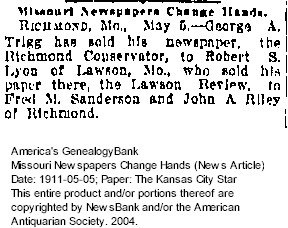 | May 5, 1911 - George A. Trigg has sold his newspaper, the Richmond Conservator, to Robert S. Lyon of Lawson, Mo., who sold his paper there, the Lawson review, to Fred M. Sanderson and John A. Riley of Richmond. | newspaper clipping | |