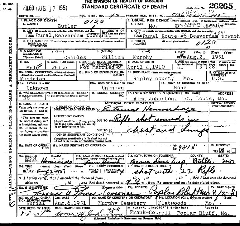 Murphy, Charles William Apr. 4, 1910 - Aug. 2, 1951. MO Death Cert.#26265