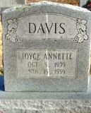 Davis, Joyce Annette 05 Oct. 1939 - 15 Nov. 1959. Daughter of Edmond D. Davis & Nova Unknown. Died in auto accident in DeSoto Mo. |