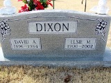 Dixon, David Allen 07 Oct. 1896 - 09 May 1984. 'US Army WWII.' Son of William Alfred 'Bill' Dixon & Rosa Forest Newton. Married Flora Virginia Counts 16 Jan. 1916 Shannon Co MO. One child, Edna Virginia, born 12 Feb. 1917 (married Ralph Lee Best, m. LawrenceLewis Lansche). Her mother Flora died 18 Apr. 1917. Dixon, Elsie May Norris 21 Oct. 1900 - 29 Jan. 2002. Daughter of Ulysses 'Grant' Norris & Mary Frances Hampton. Their children were Esco Berley (m. Wilma Jean Wakefield), Carmen 'Marie' (m. Erna Edward 'Huck' Alley), Eldon Elmo (died in infancy), Evelyn June (m. Gene Hodge, m. Dallas Charles Smith), Beulah Dean (m. Doewer 'Dora' Cleaver), George William (m. Marijane Wyatt), Frieda Yvonne (m. Ronald Jerome Voyles, m. Edward Roy Jones), Sylvia Delores (m. Earl McDowell) and Everett Allen 'Mickey'