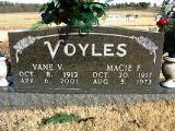 DOUBLE: Voyles, Macie Freda Atkins 20 Oct. 1907 - 05 Aug. 1973. Daughter of John Henley Atkins & Miranda Ellen LaRue. Voyles, Vane Vester 12 Oct. 1912 - 06 Apr 2001. Son of James Marion 'Jim' Voyles & Maude Hollis. Parents of Douglas K., Ronald Jerome, Larry, Stanley, Faye Elaine, Gordon and Kevin Voyles.