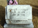Voyles, Ronald Jerome 15 Sep. 1936 - 21 May 1956. Son of Vane Vester Voyles & Macie Freda Atkins. Married Frieda Yvonne Dixon. Father of Ronald Dennis Voyles. Killed in logging accident; struck by falling tree. His neck was broken and he died instantly. His brother Doug carried him from the woods. |