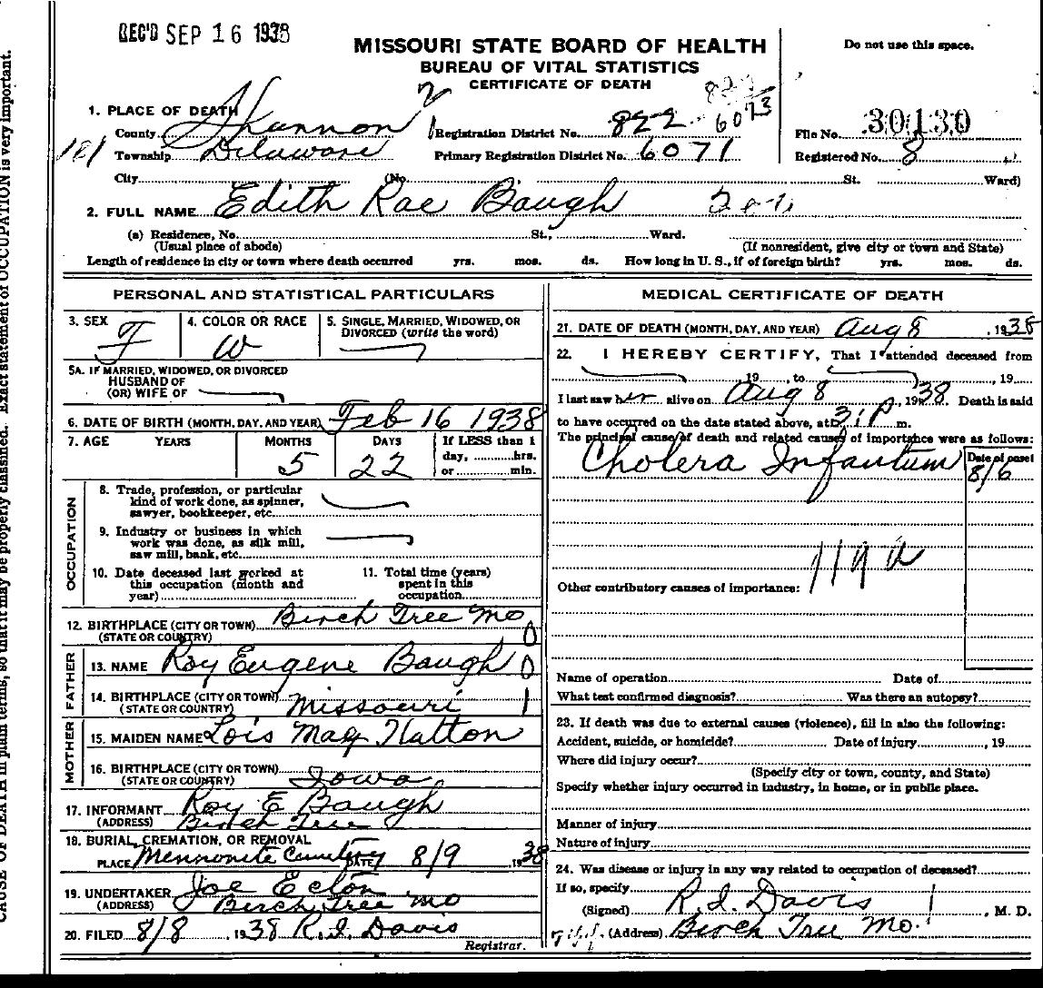 infant daughter of Roy Eugene Baugh & Lois May Hatton or Walton. |