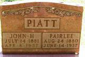 HUSBAND & WIFE: PIATT, John Harvey Jul. 14, 1881 Apr. 9, 1957. Son of Samuel Pleasant Piatt (1858 1920) & Frances Stewart (1859 1942). PIATT, Alice Parilee Smith 24 Aug 1880 - 14 June 1937. Daughter of Benjamin Newton Smith (1880 1937) & Sarah Easter Shelton (1844 1923). |