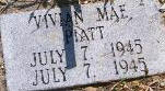 PIATT, Vivian May Born & died 07 July 1945. Child of Samuel Hugh Piatt (1909 1945) & Opal Pauline Ellerman. (1915 Unknown). | ||