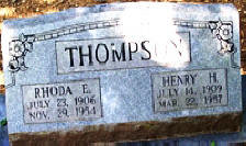 HUSBAND & WIFE: THOMPSON, Henry Harrison Jul. 14, 1909 (or 1910) Mar. 22, 1957. Son of John Daniel Thompson (1876 1959) & Carrie Arizona Price (1888 1947). Killed in sawmill accident in Illinois. THOMPSON, Rhoda Elizabeth Watson Jul. 23, 1907 Nov. 29, 1954. Daughter of John Wesley Watson (1880 1955) & Sarah Elizabeth Marrow (1882 1961). Killed in train-auto accident in Illinois. |