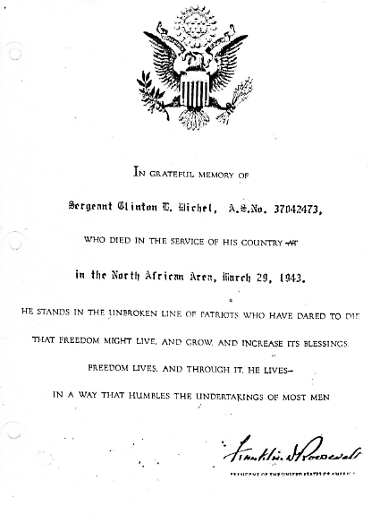Oct. 8, 1921 - Mar., 1943 Son of Mr. & Mrs. Charles Henry Michel of Hartshorn, MO. In the spring of 1941 he entered into the armed service & served until he met his death in North Africa. Great Uncle of Pat Moyer |