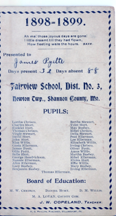 Grade card from Fairview School at Timber, Shannon Co MO. (now used for storing hay - if it is still standing today?) The picture probably was taken while James attended. Contributed by Carol Piatt |