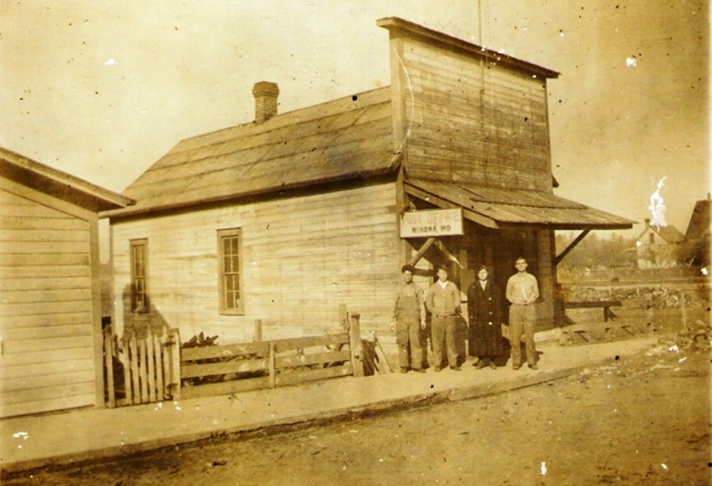 Winona Post Office Robert Lee 'Bob' Norton was the Post Master (shown on far right). Others in the photo have not been positively identified, but the woman to Bob's right may be his wife Minerva Davis. One of the other two men may be Elmer Lewis, who was a mail carrier. The date of photograph is not known, but Elmer Lewis was a mail carrier when the 1920 census was enumerated and Bob Norton was the Post Master, however, he passed away in Aug., 1920, so this was taken prior to that time. Contributed by Jean Tobey |