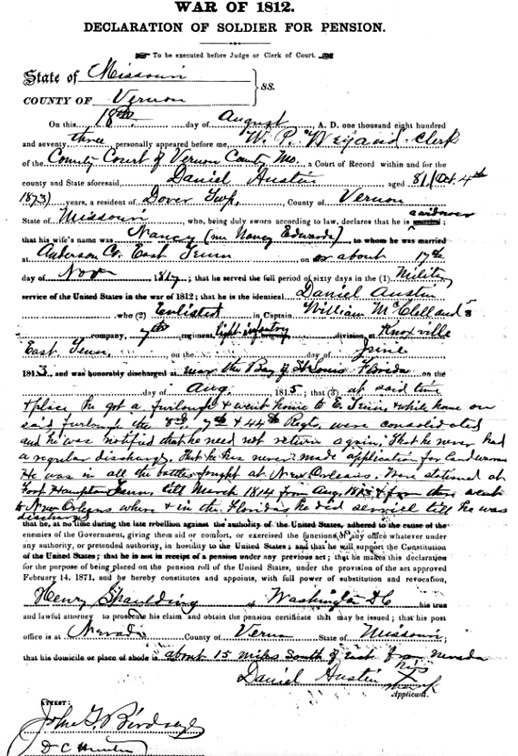 Daniel Austin was a veteran of the War of 1812, including the Battle of New Orleans as his pension application, a part of which is included below, testifies. He was the father of Thomas H. Austin, for whom Austin Blvd. in Nevada was named. Thomas Austin's biography can be found in both editions (1887 and 1911) of The History of Vernon County, Missouri with mention of his father Daniel.