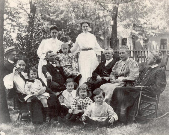 Abner Bennett Davis, wife Effie Nixon and relatives. From right to left starting with the woman in the rocker is Mrs. C. T. Davis, Effie Nixon Davis, Abner B. Davis, standing Lucillie Davis, Maude Davis Fowler, Morrison M. Davis, woman seated with child is Cella Davis Doyle, child is Dorothy, man seated with girl is Charles Gilbert with daughter Judith. Seated on ground with white collar is Alice Davis (later Wells), Corinthinia Gilbert and Merrill Doyle, ca 1900. Photo courtesy of Debbie Pitezel.