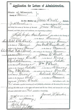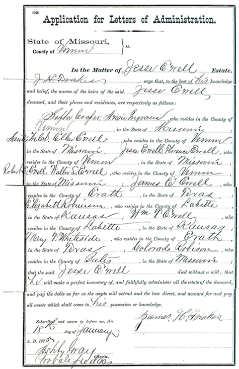 Click on the thumbnail to see the "Application for Letters of Administration" from the Vernon County, Missouri probate file of Jesse Ewell, filed January 18, 1875 by James H. Frakes. Ashby Gray, Probate Judge.