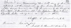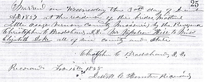 James N. Hill married Elizabeth Jane Doke on December 30, 1857 in Little Osage, Vernon County, Missouri. (Vernon County Missouri Marriage Record Book A, page 25.) Married on Wednesday the 30th day of December A.D. 1857 at the residence of the brides mother Little Osage Vernon County Missouri, by the Reverend Christopher C. Bradshaw, D.D. Mr. Napoleon Hill to Miss Elizabeth Doke all of said county and state. Christopher C. Bradshaw, D.D. Recorded Feb 15th, 1858 DeWitt C. Hunter Recorded