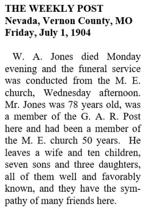 I'm attaching the obituary that was obtained at the library in Nevada, Missouri over the summer. There was an older man researching when my husband and I stopped by to see what type of records the library had. He helped me find the obituary and a copy of the will of William Arby Jones. We didn't have much time to spend at the library as we were on our way to Iowa. We also drove through Harwood and visited the cemetery. I left some small flags at the grave of William Arby Jones.