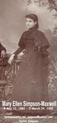 Mary Ellen Simpson, daughter of Anna and James Simpson, married J. L. 'Log' Maxwell March 2, 1898; recorded in Vernon County Missouri Marriage Record Book H, page 116. She died March 24, 1902 in Indian Territory and was buried in Bicket Cemetery, Vernon County, Missouri. |