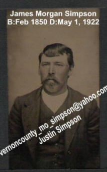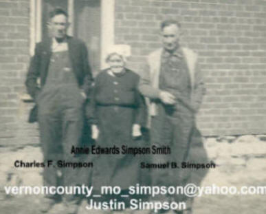 James Simpson and Annie Edwards married on March 8, 1876 as recorded in Vernon County Missouri Marriage Record Book A, page 369. They were farmers in Drywood Township in Vernon County. James Simpson moved to Brown County, Texas, following their divorce in 1901.