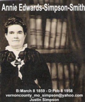 Anna E. Edwards-Simpson-Smith photograph and information was provided by Justin Simpson who can be contacted at vernoncounty_mo_simpson@yahoo.com. He provides the family story that Annie was afraid of Osage Indians and would blow a horn (made from a cow or buffalo's horn) to alert her husband, James, who was out in the field to let him know the Indians were passing through their land.