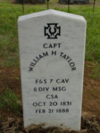 Elusive Capt. Taylor Run to Earth at Last! Then and Now by Patrick Brophy Nevada Daily Mail, Nevada, MO. June 8, 2006 Though they captured him once, Federal forces often found Capt. William Henry Taylor an elusive character. After all, that tended to be the nature of Bushwhackers. The Federals weren't the only ones to have trouble locating this Scarlet Pimpernel of the local Civil War. Like many other guerrilla leader, Taylor more or less drops from the record in the years after the war. It was long assumed he'd left the neighborhood, and died and was buried elsewhere, as was true of many others. Taylor's peer Capt. William Marchbanks, for one, settled in Paris, Texas, where he became a prosperous and respected city father. It was known, however, that Taylor was postmaster of Montevallo after the war, and that he was re-elected to his prewar office of sheriff, once ex-Rebels regained the right to vote. It was even mooted he might have been buried on a Taylor property just east of Montevallo. In March the "lost" Capt. Taylor was triumphantly found. While perusing old newspaper microfilm, genealogist Nancy Thompson serendipitously stumbled on an obituary dated Feb. 21, 1888, titled "An Old Citizen Dead." "William H. Taylor died at his home in Montevallo at an early hour this morning," began the article," of pneumonia. He was about sixty years of age." There were many "abouts" it seems, in Taylor's life story. Most of the facts revealed in the obituary, and in the followup the next day, were lifted straight out of "The History of Vernon County," published only the year before. And they came not so much from Taylor's biography as from the section titled "Some Noted Confederate Partisans." Taylor was born in Kentucky in 1831, and as a child moved to Warren County, Mo., with his parents. He came on alone to Vernon County at age 18. He was appointed sheriff in 1858 to fill out the unexpired term of James Fergus, and was elected to the office in 1860. When the Civil War began, hardly a year later, Taylor resigned and was commissioned quartermaster captain in the 7th Cavalry (D. C. Hunter's regiment) of the 8th Division of the Missouri State Guard. In late 1861 he raised a company of 70 men at Montevallo for service with Col. John T. Coffee. This stirring beginning to his military career was cut short when he was surprised at breakfast in a house southwest of Montevallo and captured by the 1st Iowa Cavalry, which went on to burn the town before withdrawing. Taylor was imprisoned first at Fort Scott, then at Fort Leavenworth, but was released within six months, having given his "parole" (his promise not to fight until formally "exchanged") He was as good as his word, moving to Nevada and reporting regularly at Fort Scott. His house was burned, along with the rest of Nevada, on May 26, 1863. The Federal militia firebugs were about to haul Taylor off, likely to kill him, when "he was saved by the compass and square," the commanding officer happening to notice Masonic insignia on some papers of Taylor's. In September 1863, Taylor was formally exchanged, and at once "went upon the warpath." He reported to Capt. Marchbanks at Cephas Ford, north of Nevada, and was given Pony Hill and five other Bushwhackers, with whom he had the audacity to invade Kansas! Taylor passed the rest of the war in stirring Bushwhacker exploits, sometimes with Capt. Marchbanks, at other times independently, and like other guerrillas spending the winters in East Texas. As the war wound down in May 1865, Taylor's little band was the last Rebel force still under arms in the area. After negotiations through Judge J. H. Requa, he came into Nevada and surrendered to Lt. Col. D. C. Vitturn of the 3rd Wisconsin Cavalry. He spent time in Illinois, where he'd sent his family, and in Nebraska, before returning to Vernon County in 1868, to be re-elected sheriff in 1872. Following further wanderings, including a job surveying Eureka Springs, Ark., he returned to stay in 1883, opening a store in Montevallo, and two years later being named Montevallo's postmaster by president Grover Cleveland. Taylor married twice, first to Miss Emaline Gresham, in 1853. She died only a year later, leaving him a son, Willie S. In 1861 Miss Sarah E. Pottorff, of Illinois, became his second wife. They too had a son, rather confusingly named Willis H. The obituary discovered by Nancy Thompson made it clear that Taylor was laid to rest in Deepwood Cemetery. But just where in the cemetery? A modern-style Pottorff stone has long stood just south of Deepwood's center drive. Less obvious is the name "Taylor" cut in the limestone coping around the lot, whose purchaser's name is indeed on record as W. H. Taylor. But nobody ever got around to marking the graves of either Taylor or Sarah. Odds are times were pinched for them, as for other ex-Confederates. The veteran marker ordered by the Col. John T. Coffee Camp No. 1934 of the Sons of Confederate Veterans arrived in record time, and was erected last Tuesday evening by SCV members UNA 17. It will be dedicated and Taylor memorialized at 11 a.m., Saturday, in a public ceremony complete with costumed Civil War re-enactors, period music, and a rifle salute. It will be the third such honoring of a prominent Vernon County Confederate during this sesquicentennial year. Capt. Alfred Cummins was saluted during Bushwhacker Days 2005, and Col. DeWitt C. Hunter on Oct. 1. All three men were respected holders of city or county offices, as well as courageous and honorable Confederate officers. Taylor, notes the county history, "united the commission and authority of a Confederate soldier with the tactics and warfare of a guerrilla or bushwhacker." "One of the bravest soldiers who enlisted for service during the late war on the side of the Confederacy," the history's account sums him up. Even the "politically correct" can't overlook the fact that the government-furnished stone calls Taylor both a "field and staff" officer of both the