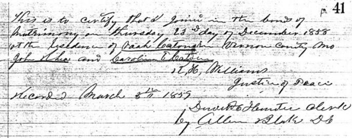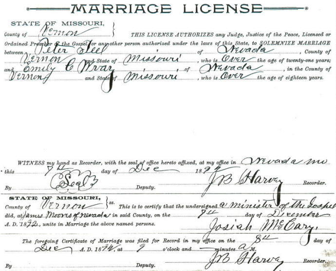 Mrs. Caroline Emily (Caton) Wray & Peter Teel marriage record: Vernon County Missouri Marriage Record Book F, p. 251.